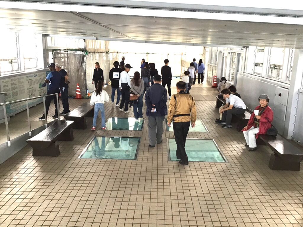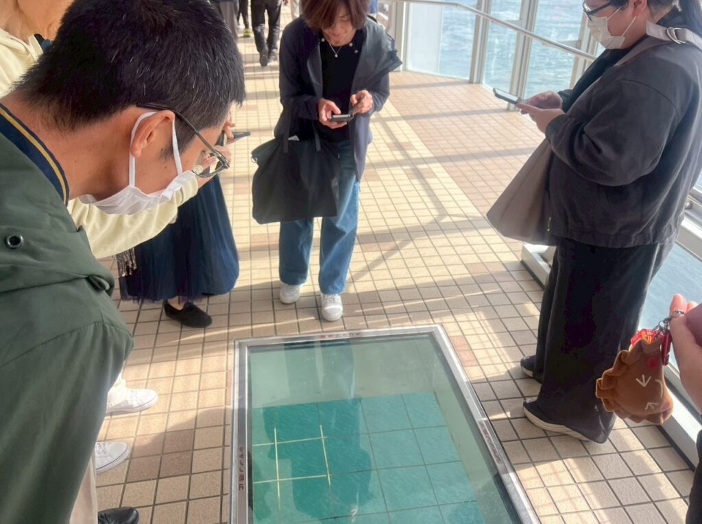 残念ながら本日の満潮は8時で、渦が巻いていませんでしたが、ガラス張りの海を眺めたり、ガラスの上を歩いたりと楽しんでいただき、海水がとてもきれいで皆さん感激でした。大鳴門橋を通る時、橋の上から少しだけ渦は見えたんですけどね。渦の道歩いてたら消えていきました、残念。