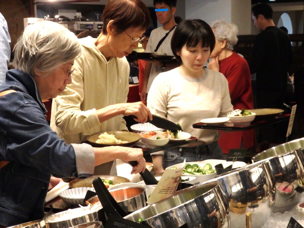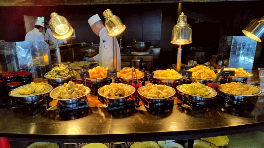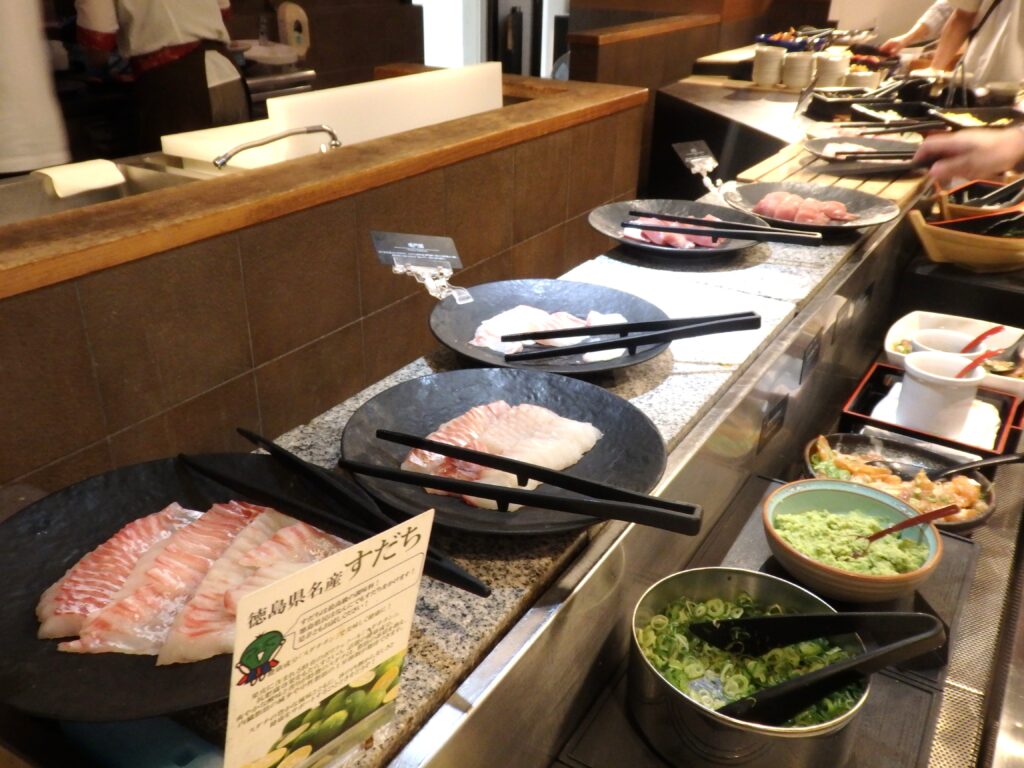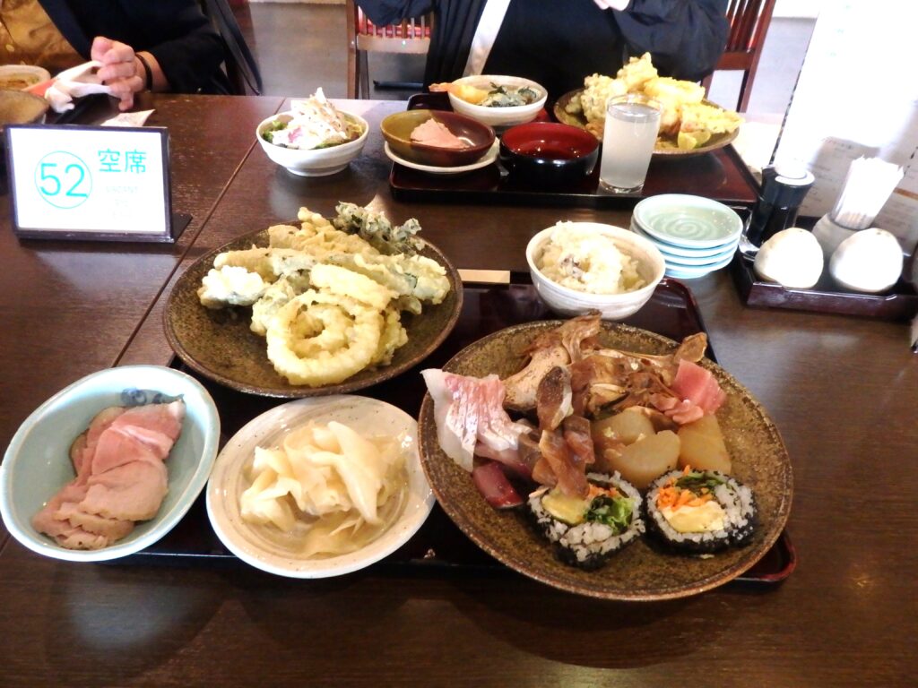 お待ちかねの「阿波三昧バイキング」盛りだくさんの天ぷらは鳴門わかめや鳴門れんこんに淡路の玉ねぎ、鳴門さつまいもなどとても美味しかったです。次々揚げてくれるので、熱々をいただいてエビも何本もパクつきました
