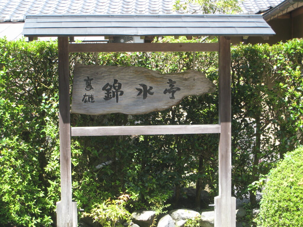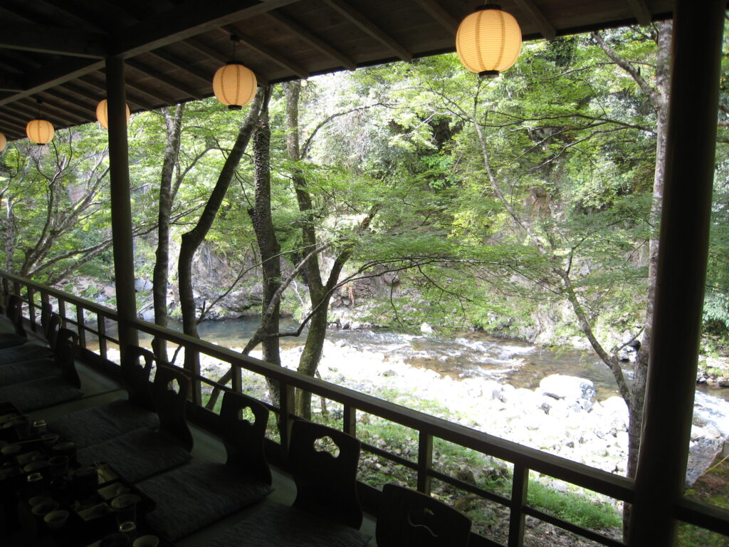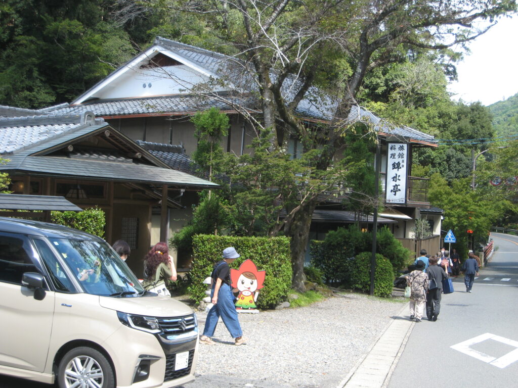 山道を北上し、「高雄錦水亭」に到着しました。川床料理、楽しみです!