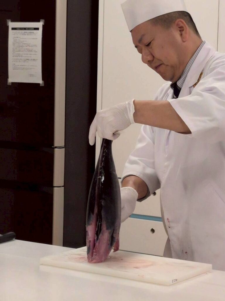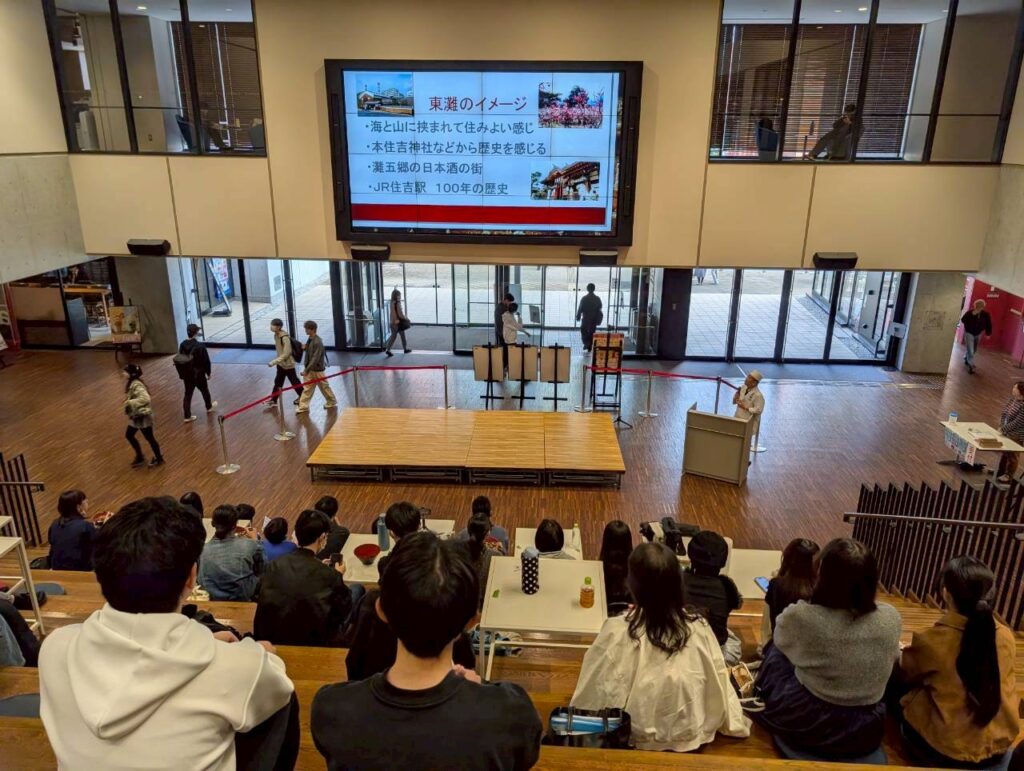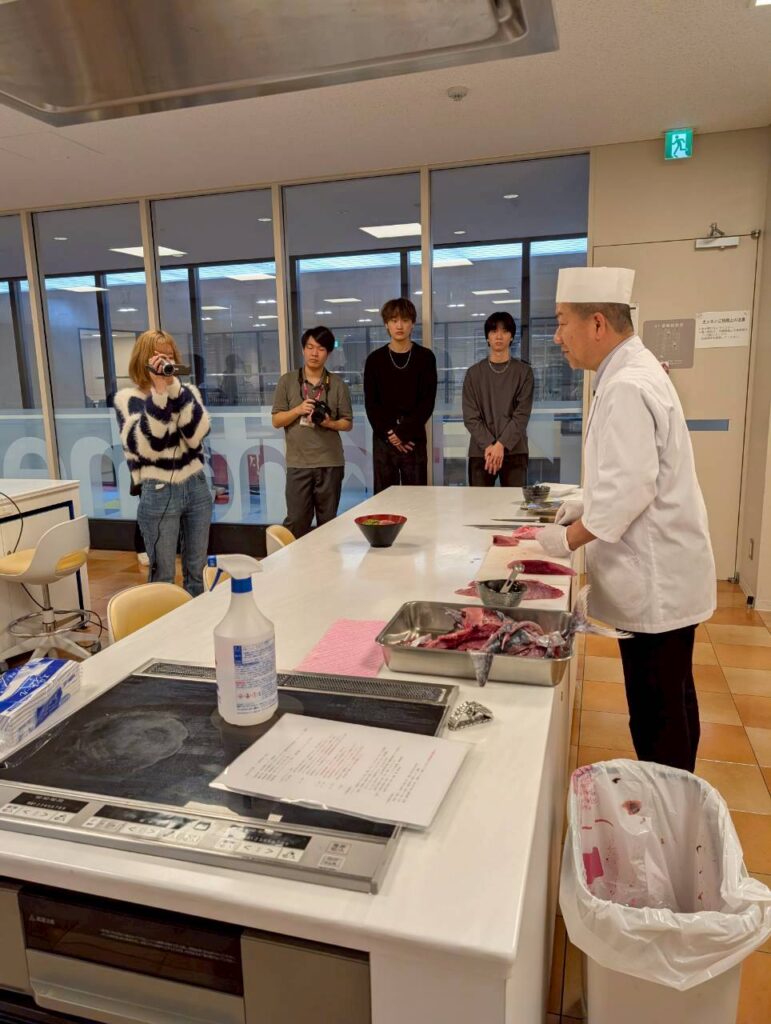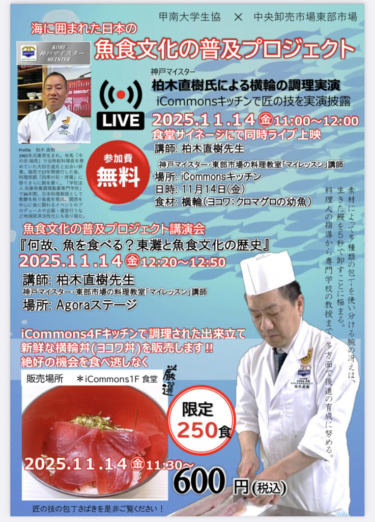 甲南大学のイベントを!ヨコワを卸して 11月14日、去年も人気の甲南大学のイベント、今年は、ヨコワを卸して、250人前の提供です。 去年はカンパチ、200人前が15分で完売したので、50食増やして! 先ずは卸し方をライブ配信、これが食堂に流れてます。学生さんは茶花道部の皆さん。此方で250人前を8時から、卸して引きました。 そして食堂のエントランスでの講義。 皆さん熱心に聴き入ってくれました。 今年も丼は完売しました。 2025/11/17