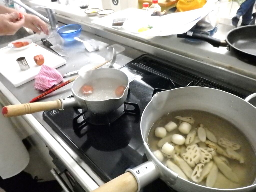 こんにゃくは手綱にきり、それぞれ下茹でして調味料で、煮込みます。