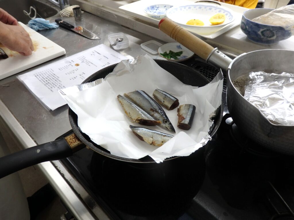ゆずの絞り汁を加えた幽庵地に漬け込み、さんまとさわらをフライパンで焼きます。