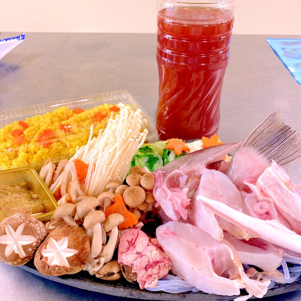 まな板いっぱいの、うちははぎを1人一尾卸します。魚は、松正水産の新鮮なはぎ、野菜は、野口青果のです。